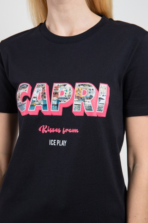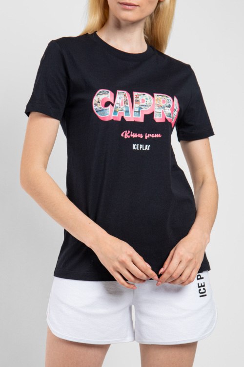 Женская черная футболка из хлопка от Ice Play (Айс Плей). Классическая длина, круглый вырез горловины, короткие рукава, на груди принт с логотипом бренда