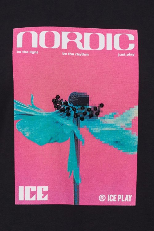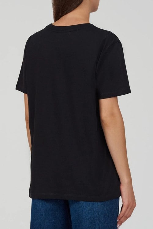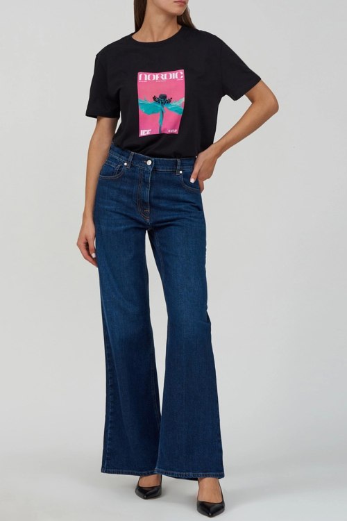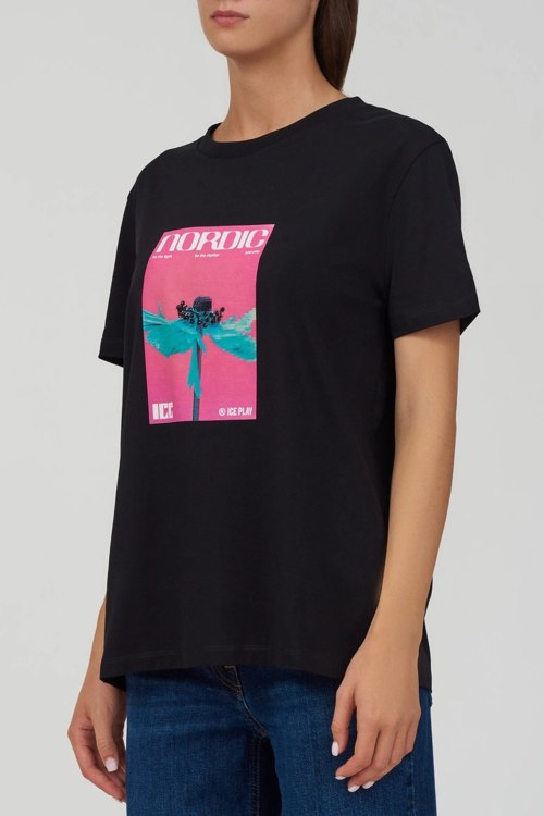 Детали: Женская черная хлопковая футболка от Ice Play (Айс Плей). Принт на груди, круглый вырез горловины, короткий рукав, классическая длина