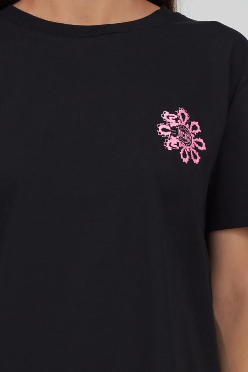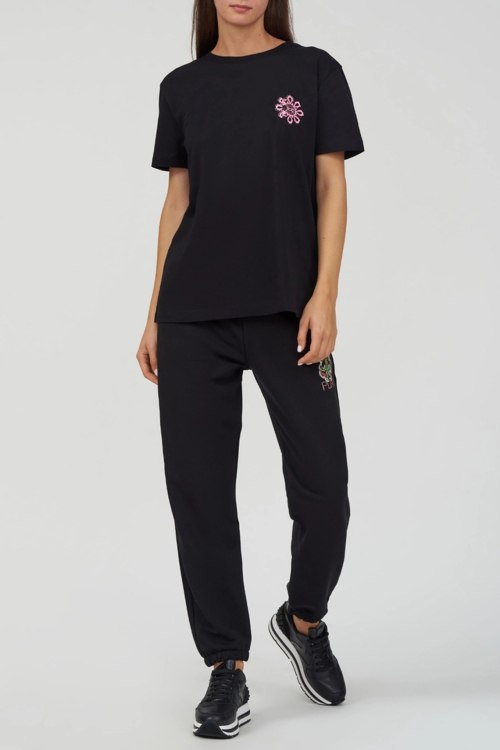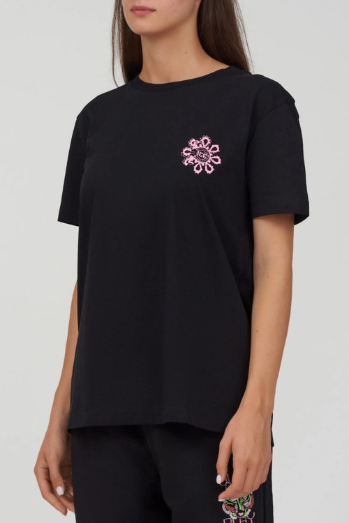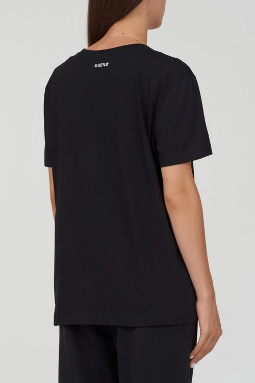 Детали: Женская черная хлопковая футболка от Ice Play (Айс Плей). Вышивка на груди, круглый вырез горловины, короткий рукав, классическая длина