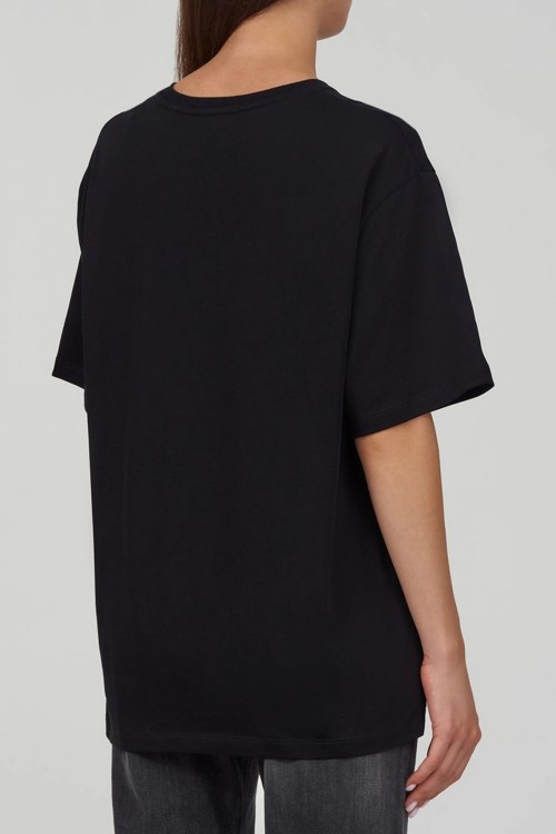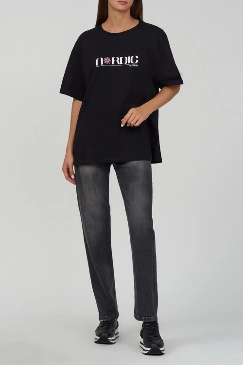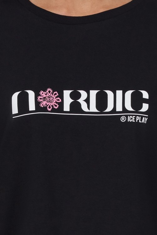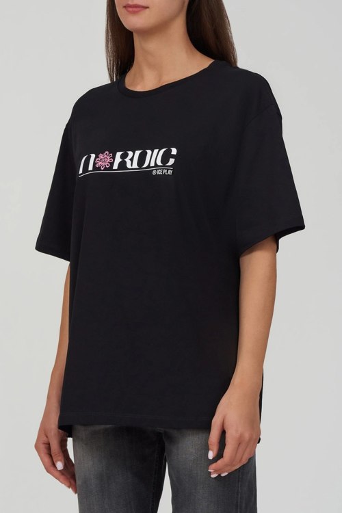 Детали: Женская черная хлопковая футболка от Ice Play (Айс Плей). Принт на груди, круглый вырез горловины, короткий рукав, удлиненная длина