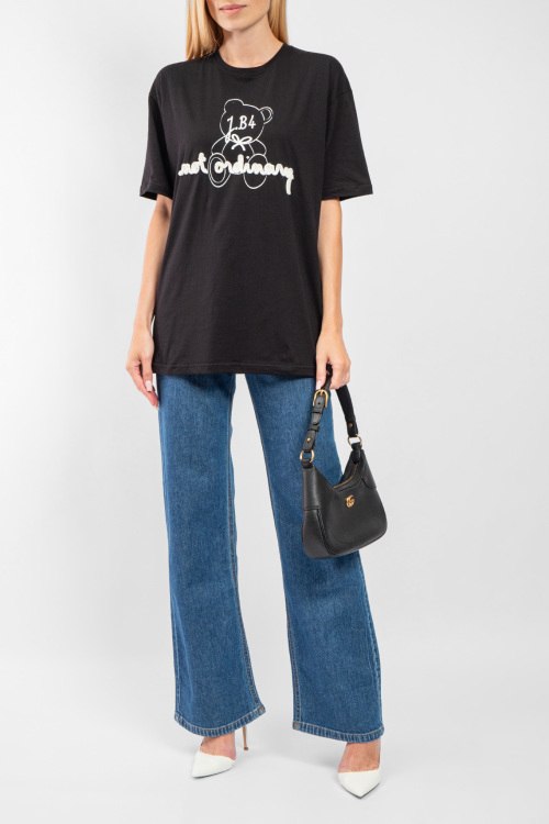 Женская черная хлопковая футболка от J.B4 Just Before (Джаст Бифо). Принт и вышивка на груди, круглый вырез горловины, короткий рукав, удлиненная длина.