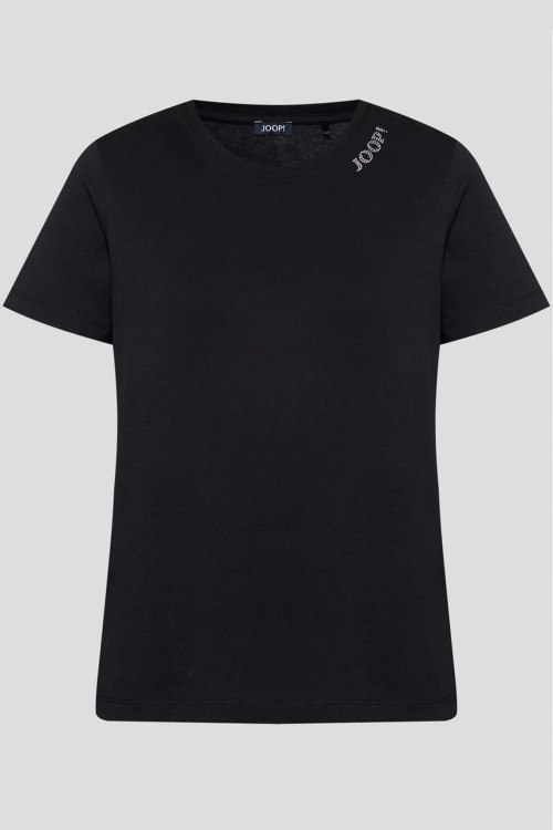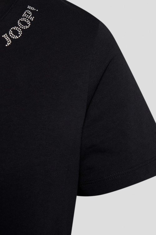 Детали: Женская черная хлопковая футболка от Joop! (Йооп!). Логотип из кристаллов, круглый вырез горловины, короткий рукав, классическая длина. Длина рукава: короткий, для размера 38 - 20 см, обхват груди: для размера 38 - 90 см, обхват талии: для размера 38 - 90 см, длина изделия по среднему шву спинки от горловины: для размера 38 - 61 см