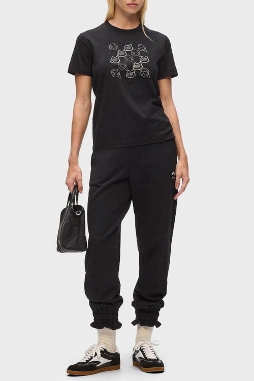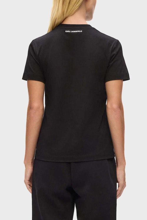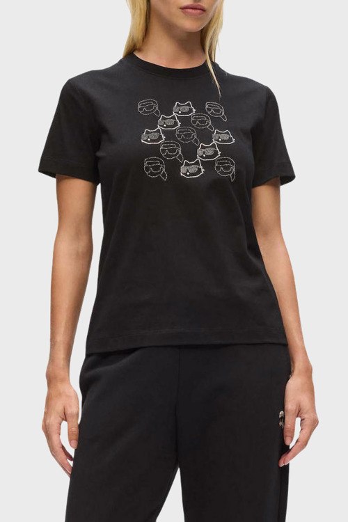 Детали: Женская черная хлопковая футболка Ikon Rhinestone от Karl Lagerfeld (Карл Лагерфельд). Логотипы с кристаллами на груди, круглый вырез горловины, короткий рукав, классическая длина