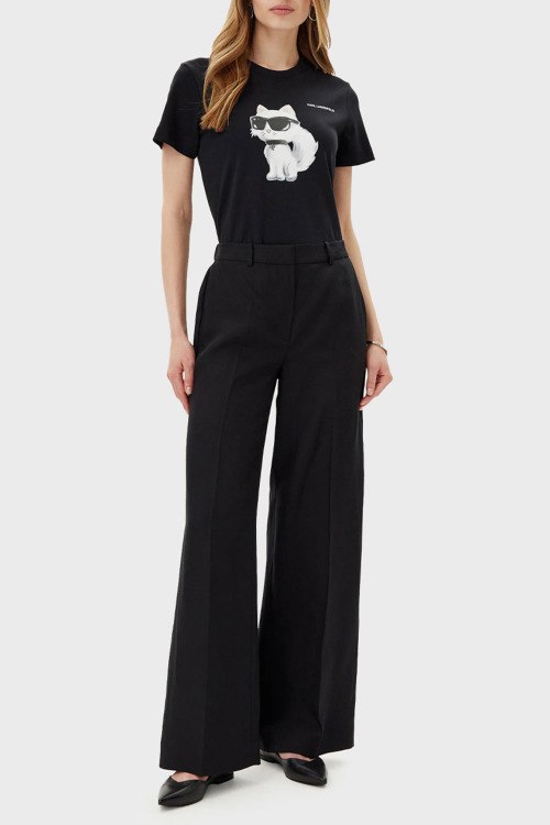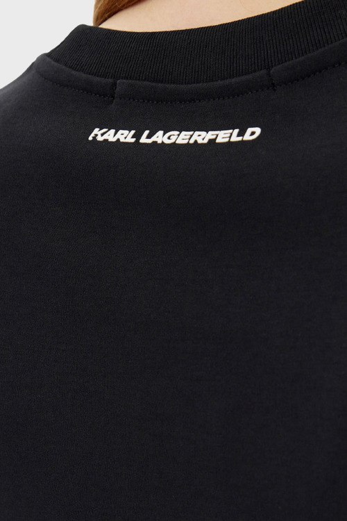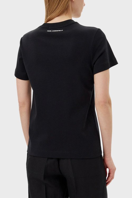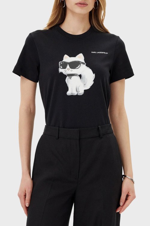 Детали: Женская черная хлопковая футболка Ikon Aquarelle от Karl Lagerfeld (Карл Лагерфельд). Принт на груди, круглый вырез горловины, короткий рукав, классическая длина