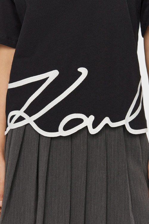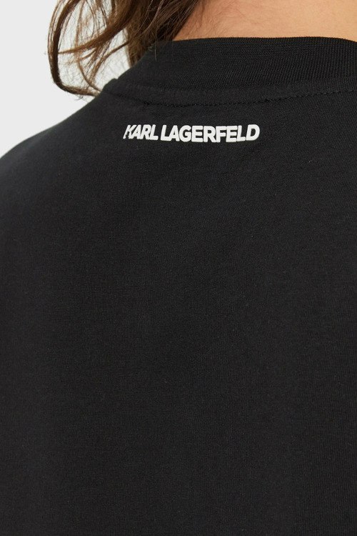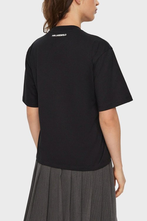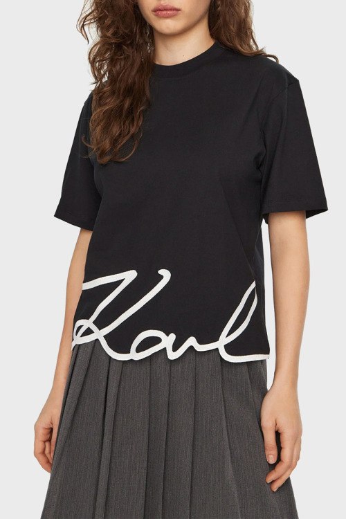 Детали: Женская черная футболка K/Signature из органического хлопка от Karl Lagerfeld (Карл Лагерфельд). Круглый вырез горловины, короткие рукава, принт с логотипом бренда