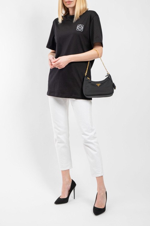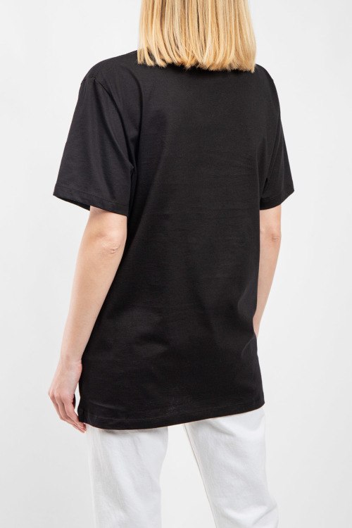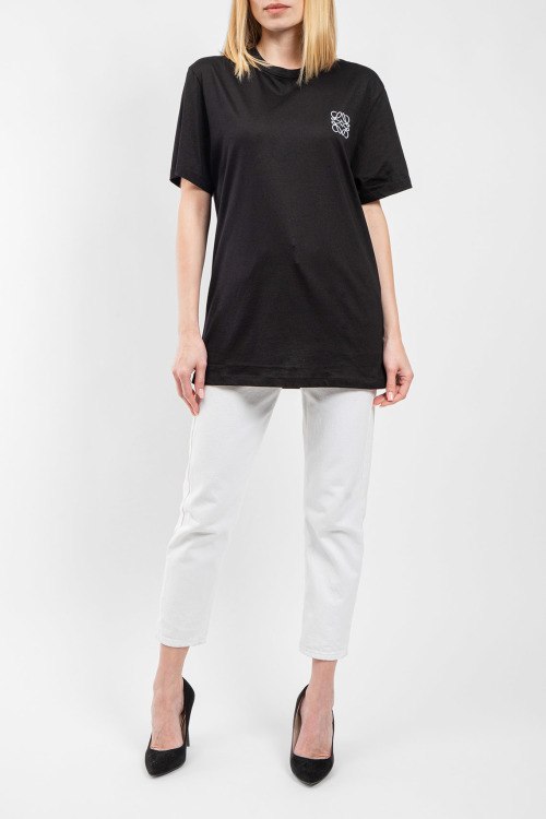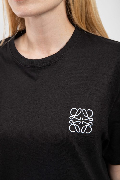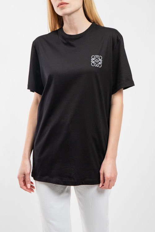 Женская черная хлопковая футболка от Loewe (Лоэйве). Вышивка на груди, круглый вырез горловины, короткий рукав, удлиненная длина. Замеры для размера на фото: M; длина - 75,5 см; ПОГ - 52,5 см; ПОТ - 51 см; ПОБ - 51 см; длина по внутреннему шву рукава - 8,5 см; ширина рукава - 23 см.