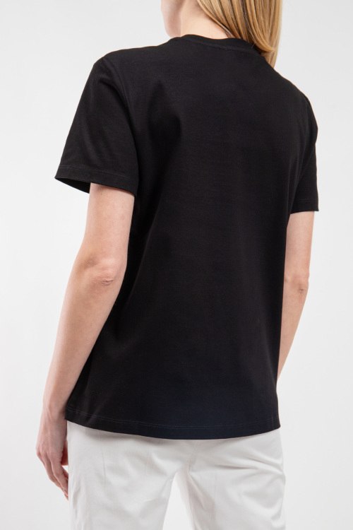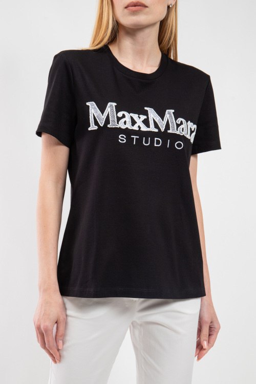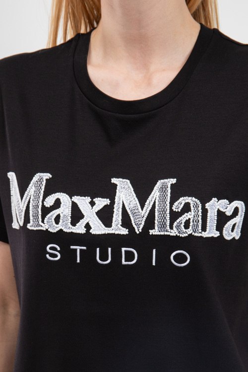Женская черная хлопковая футболка Won от Max Mara Studio (Макс Мара Студио). Вышитый логотип на груди, круглый вырез горловины, короткий рукав, классическая длина.