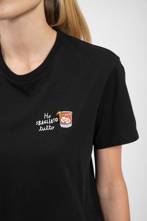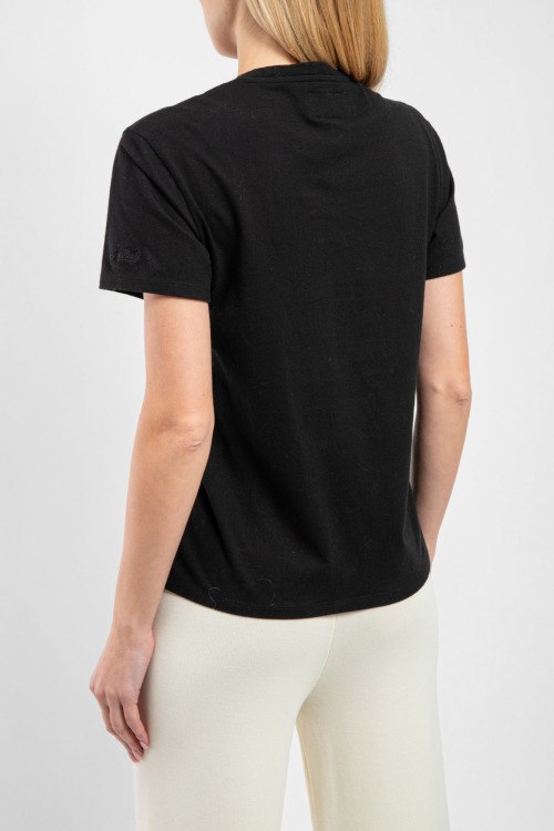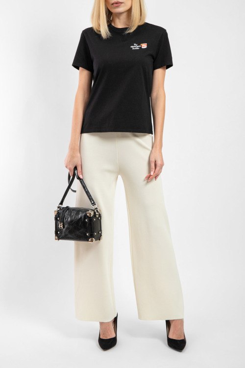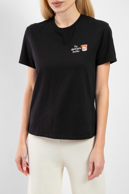 Женская черная футболка Emilie из хлопка от Mc2 Saint Barth (Mc2 Сент Барт). Классическая длина, круглый вырез горловины, короткие рукава, принт на груди.