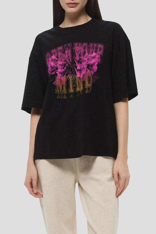 Детали: Женская черная футболка из хлопка от Hugo by Hugo Boss (Хуго бай Хуго Босс). Дизайн с графическим принтом на груди, круглый вырез горловины, короткие рукава, свободный силуэт