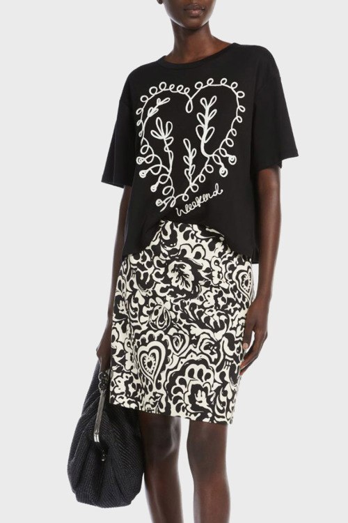 Детали: Женская черная футболка из хлопка от Max Mara Weekend (Макс Мара Викенд). Классическая длина, модель Relaxed Fit, круглый вырез горловины, короткие рукава, модель декорирована нашивкой спереди логотип бренда