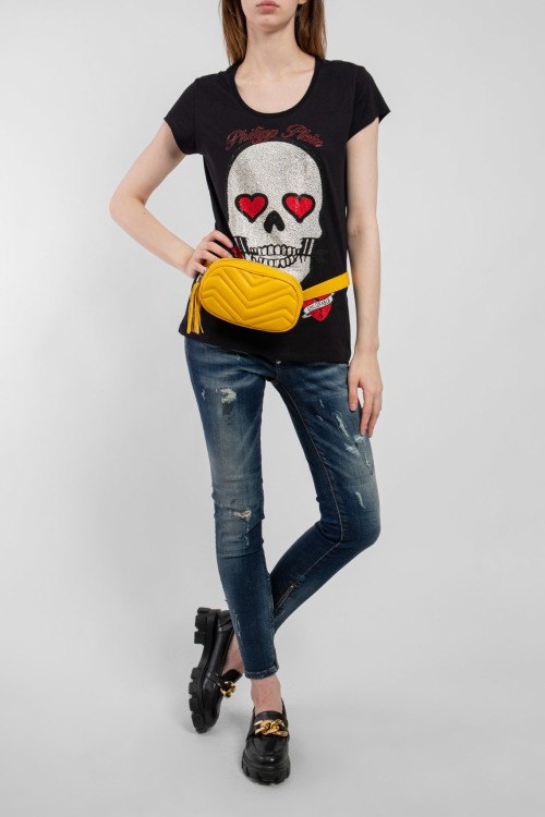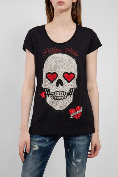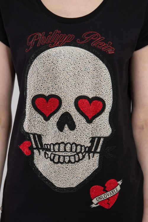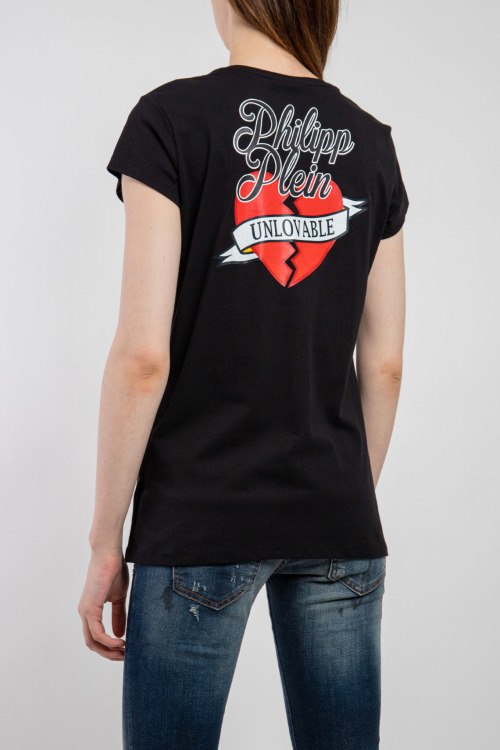Женская черная футболка Unlovable из хлопка от Philipp Plein (Филипп Плейн). Круглый вырез горловины, короткие рукава, приталенный силуэт, спереди декорирован аппликацией из кристаллов в виде черепа, принт на спине с логотипом бренда.
