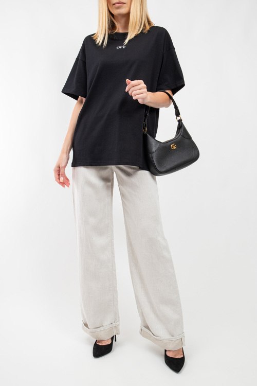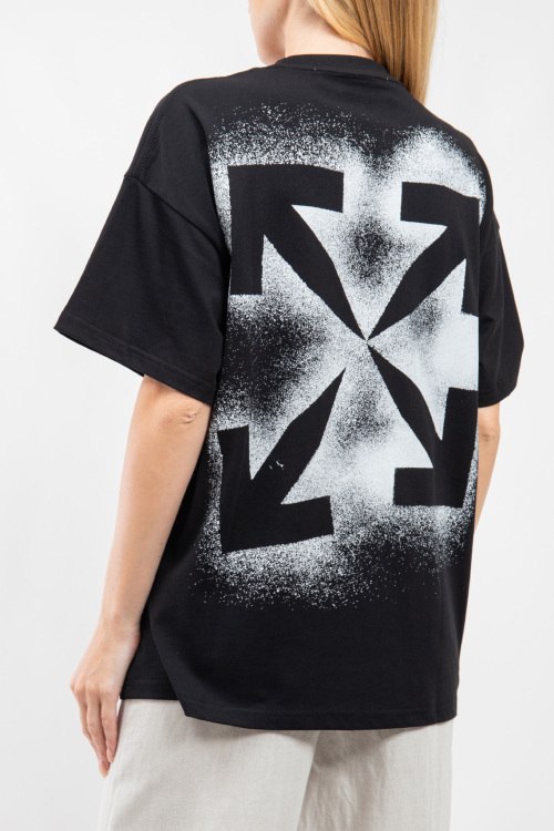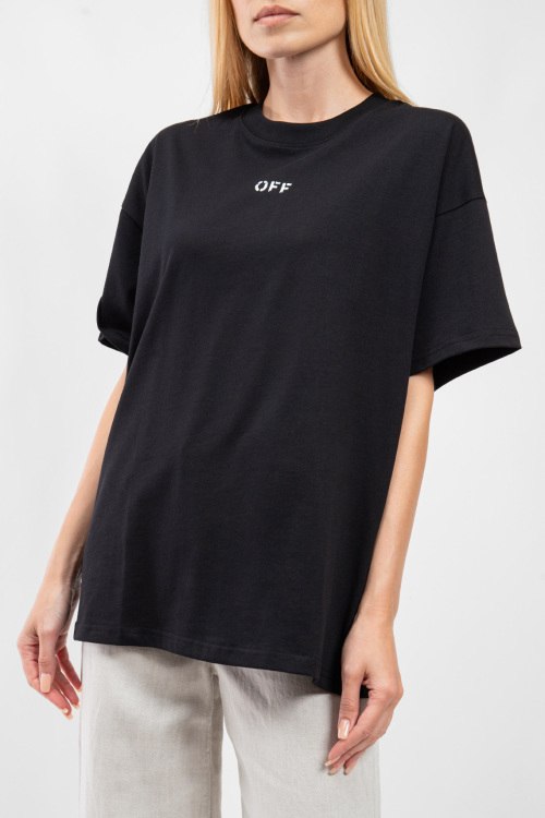 Детали: Женская черная хлопковая футболка от Off-White (Офф-Вайт). Фасон oversize, принт на груди и на спине, круглый вырез горловины, короткий рукав, удлиненная длина