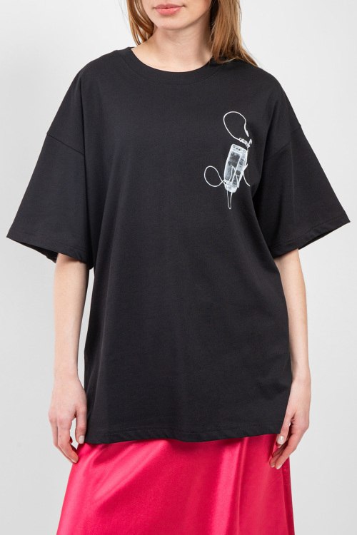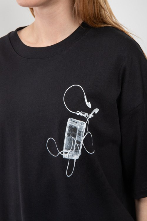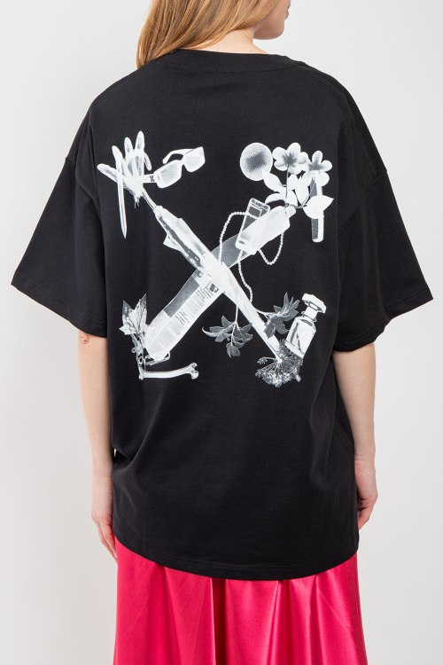 Женская черная хлопковая футболка от Off-White (Офф-Вайт). Принт на груди и на спине, круглый вырез горловины, фасон oversize, короткий рукав, удлиненная длина.
