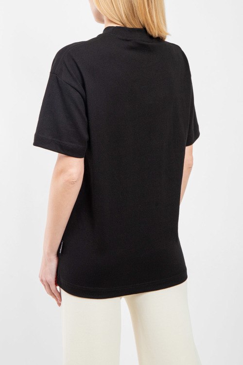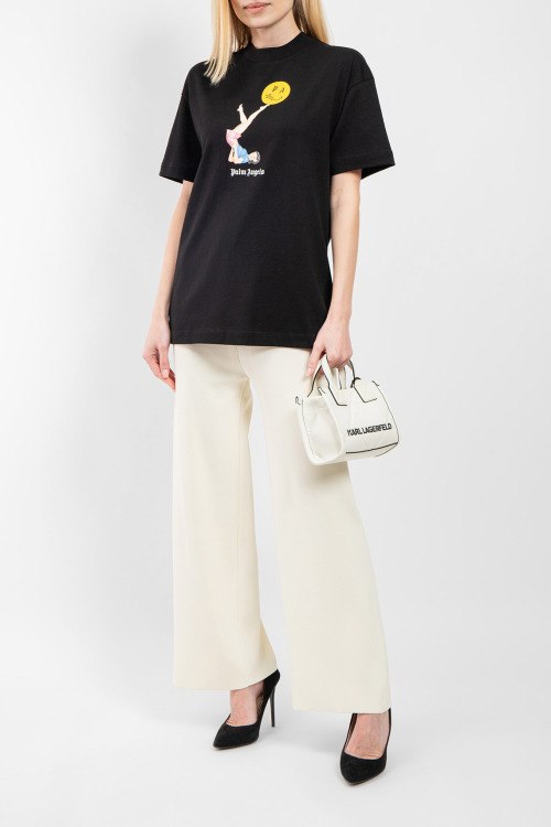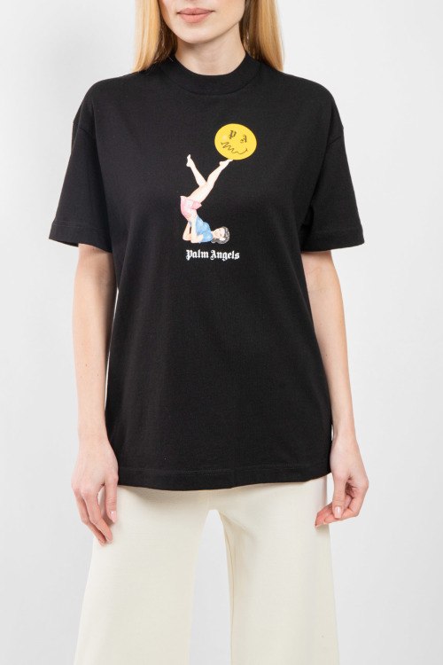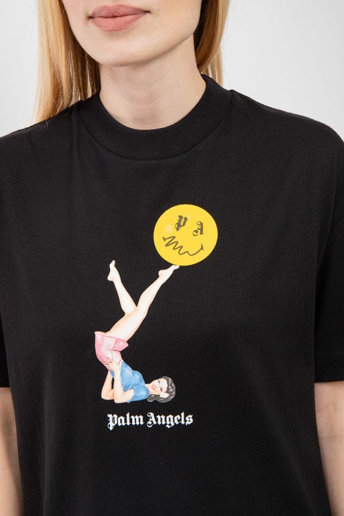 Женская черная хлопковая футболка от Palm Angels (Палм Энджелс). Принт на груди, круглый вырез горловины, короткий рукав, классическая длина.