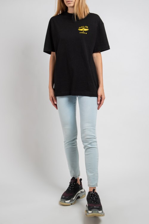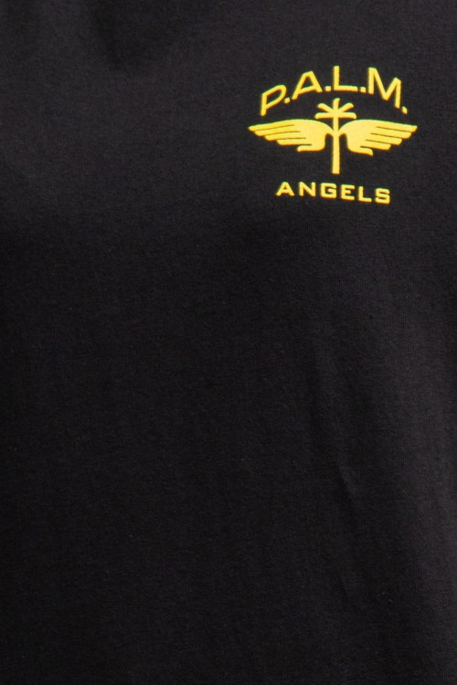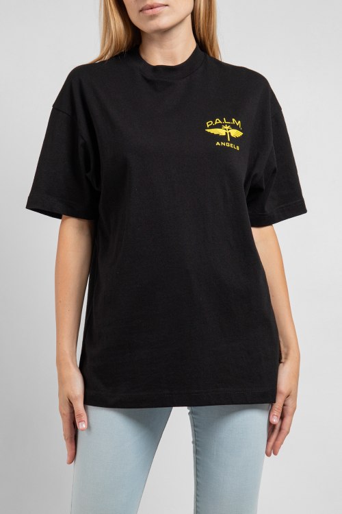 Детали: Женская черная хлопковая футболка от Palm Angels (Палм Энджелс). Двухсторонний принт с логотипом, круглый вырез горловины, короткий рукав