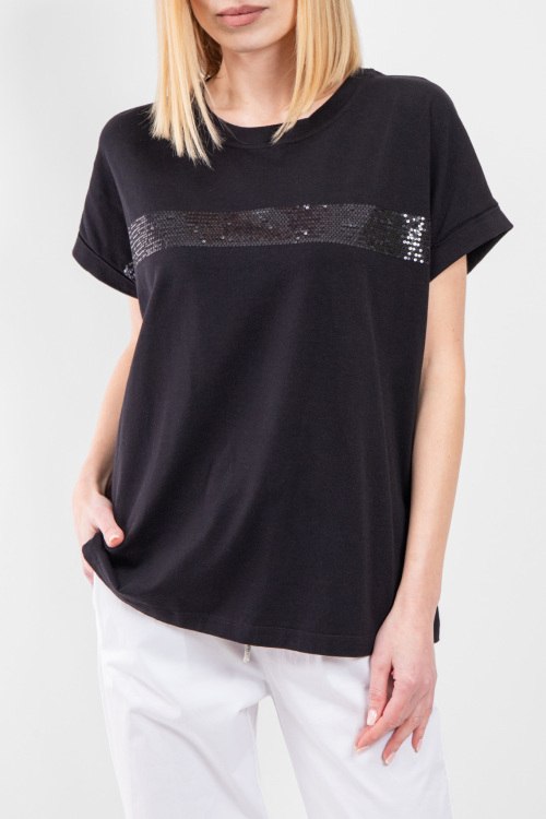 Женская черная футболка из хлопкового микса от Panicale Cashmere (Паникале Кашемир). Круглый вырез горловины, короткие рукава, модель декорирована аппликацией из пайеток на груди. Замеры для размера 48: длина: 65 см, ширина по груди: 61 см, ширина по талии: 60 см, Ширина по бедрам 61 см длина рукава по внутреннему шву: 11 см, ширина рукава: 17 см.