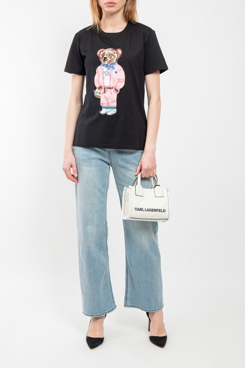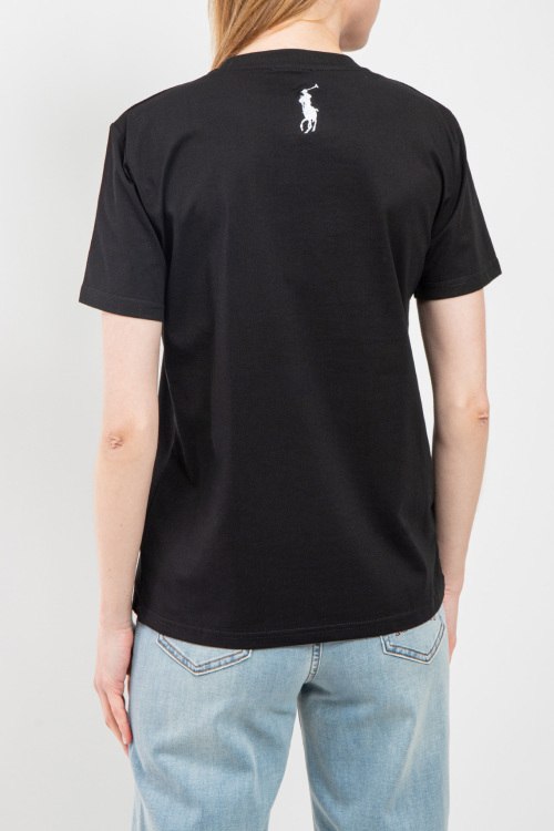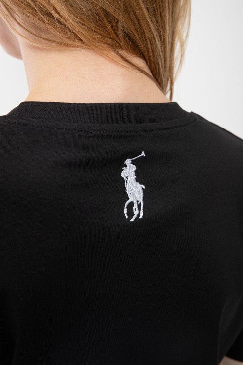 Женская черная хлопковая футболка Polo Bear от Ralph Lauren (Ральф Лорен). Вышивка на груди, круглый вырез горловины, короткий рукав, классическая длина.