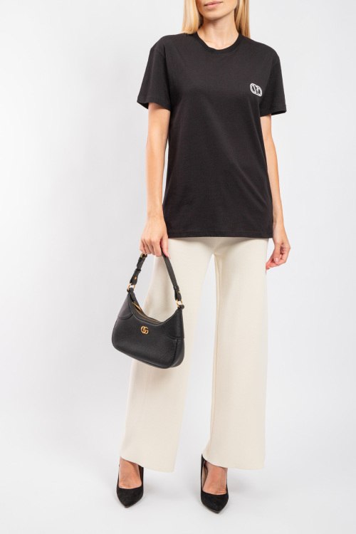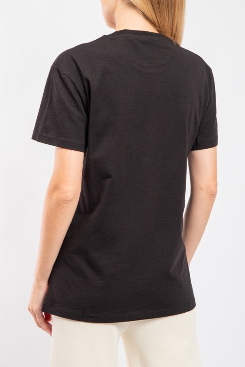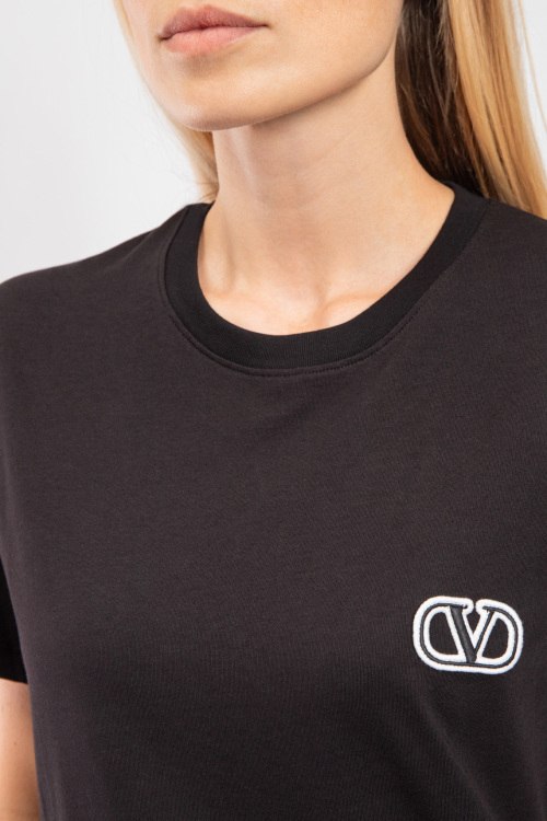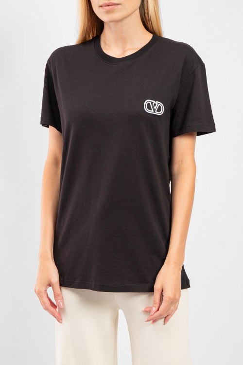Женская черная хлопковая футболка от Valentino (Валентино). Логотип на груди, круглый вырез горловины, короткий рукав, удлиненная длина.
