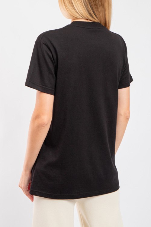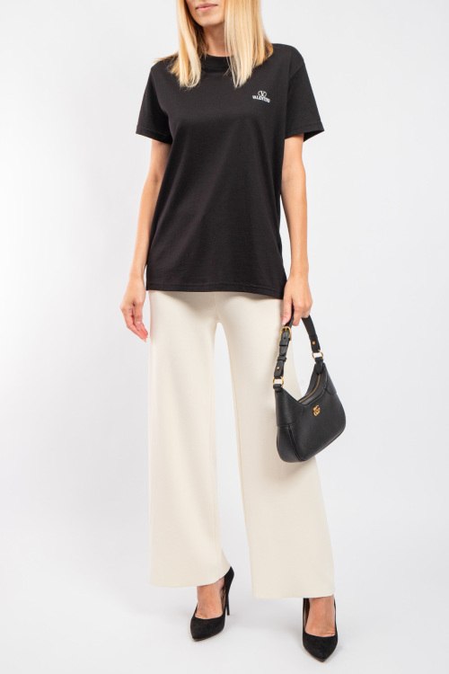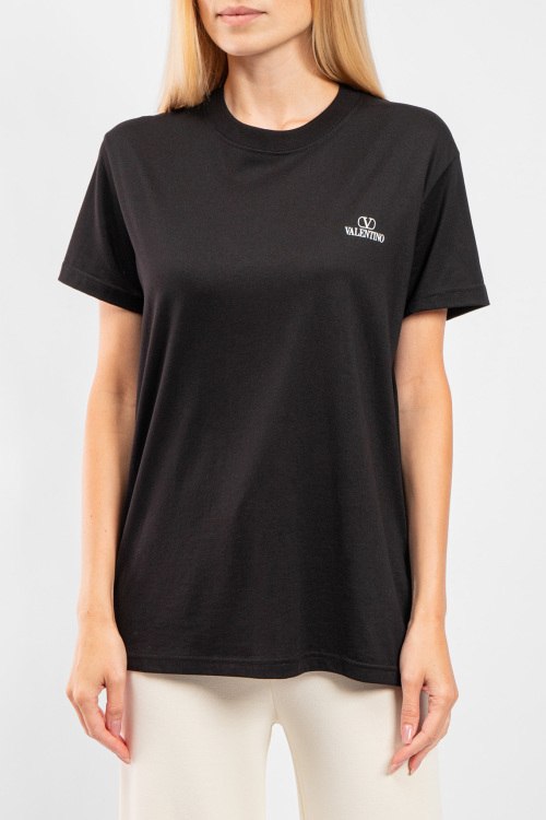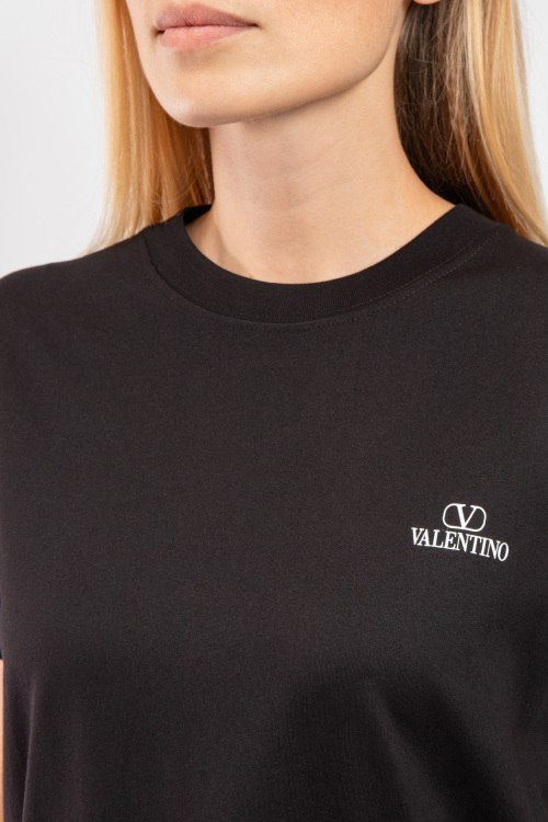 Женская черная хлопковая футболка от Valentino (Валентино). Логотип на груди, круглый вырез горловины, короткий рукав, удлиненная длина.