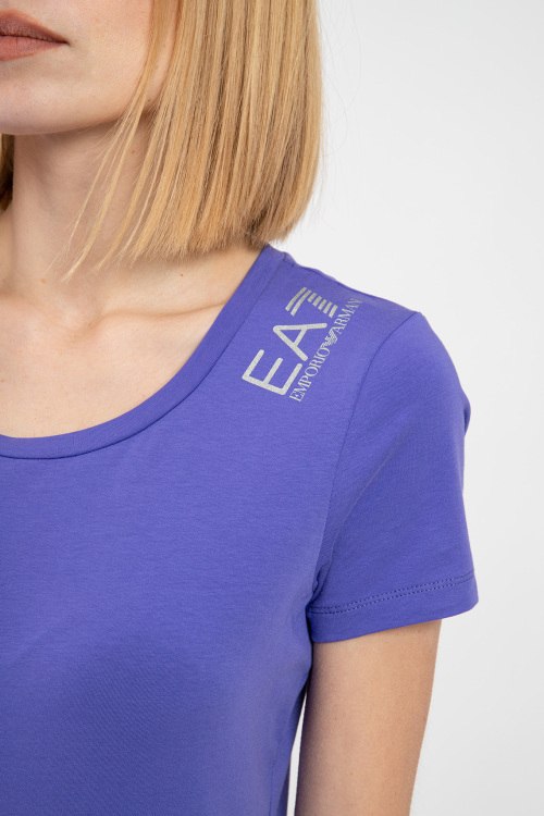 Детали: Женская фиолетовая хлопковая футболка от EA7 Emporio Armani (ЕА7 Эмпорио Армани). Принт с логотипом на плече, круглый вырез горловины, короткий рукав, классическая длина