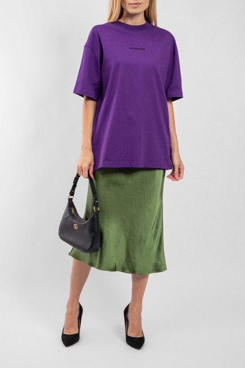 Женская фиолетовая хлопковая футболка от Balenciaga (Баленсиага). Фасон oversize, логотип на груди и на спине, круглый вырез горловины, короткий рукав, удлиненная длина.