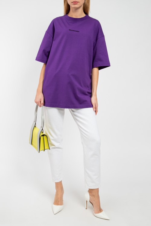 Детали: Женская фиолетовая хлопковая футболка от Balenciaga (Баленсиага). Принт с логотипом спереди и сзади, фасон oversize, круглый вырез горловины, короткий рукав, удлиненная длина