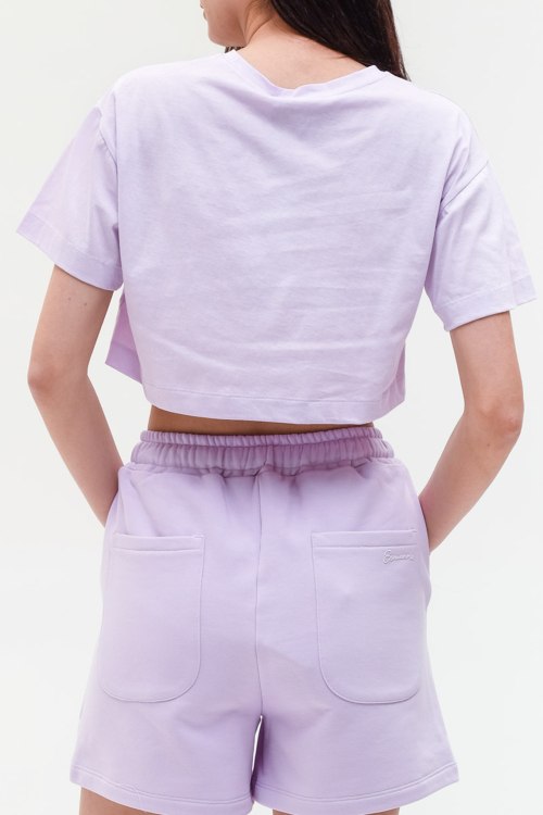 Детали: Женская сиреневая хлопковая футболка от Ermanno Scervino (Эрмано Шервино). Укороченная длина, цветочный принт с логотипом, круглый вырез горловины, короткий рукав