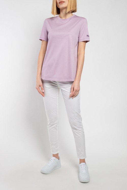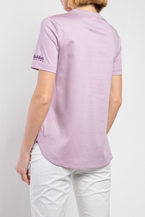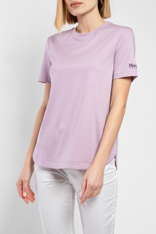 Детали: Женская сиреневая хлопковая футболка от Max Mara Leisure (Макс Мара Лэжэ). Круглый вырез горловины, короткий рукав с вышитым логотипом, закругленный нижний край