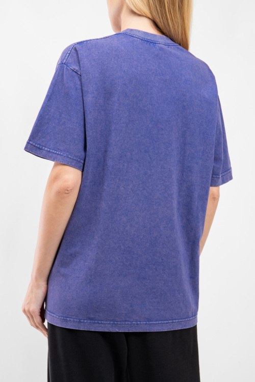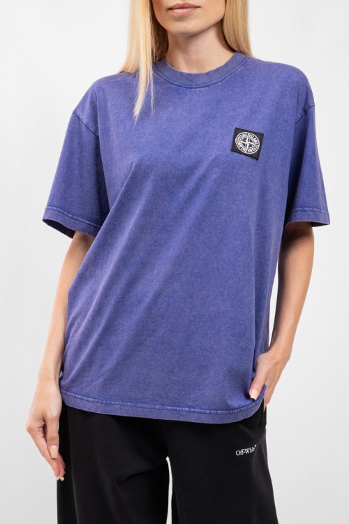 Женская фиолетовая хлопковая футболка от Stone Island (Стоун Айленд). Фасон oversize, логотип на груди, круглый вырез горловины, короткий рукав, удлиненная длина.