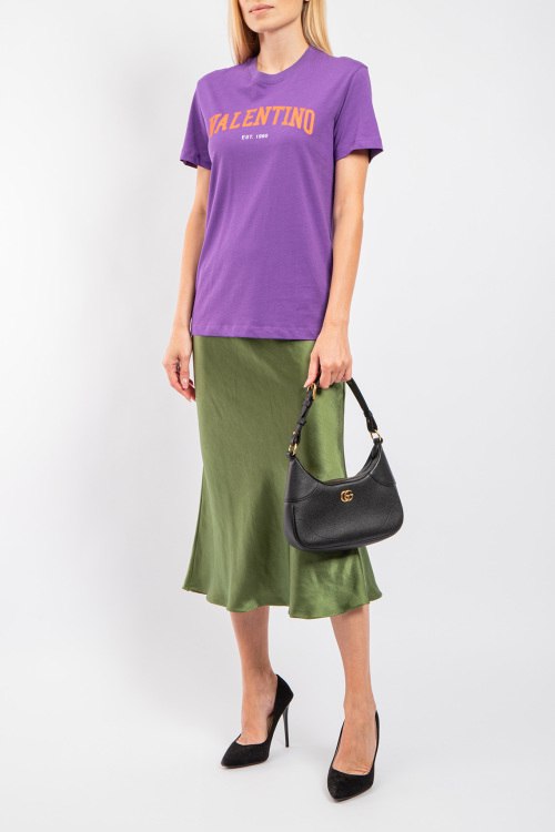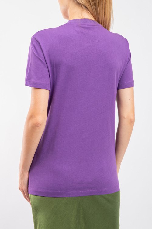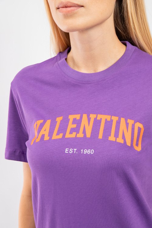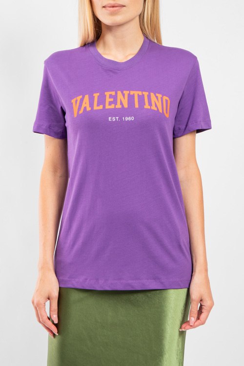 Женская фиолетовая хлопковая футболка от Valentino (Валентино). Логотип на груди, круглый вырез горловины, короткий рукав, удлиненная длина.