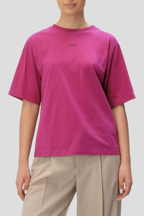 Детали: Женская футболка Enis цвета фуксии из хлопка от Hugo Boss (Хуго Босс). Классическая длина, круглый вырез горловины, короткие рукава, логотип бренда на груди