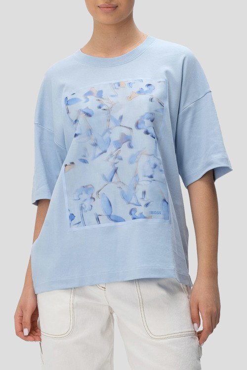 Детали: Женская голубая хлопковая футболка от Hugo Boss (Хуго Босс). Принт на груди, круглый вырез горловины, короткий рукав, фасон oversize