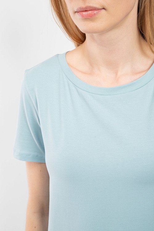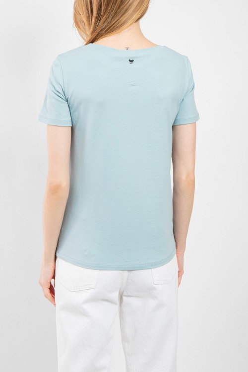 Женская голубая футболка из хлопкового миска от Max Mara (Макс Мара). Круглый вырез горловины, короткие рукава, принт с логотипом бренда сзади на горловине.