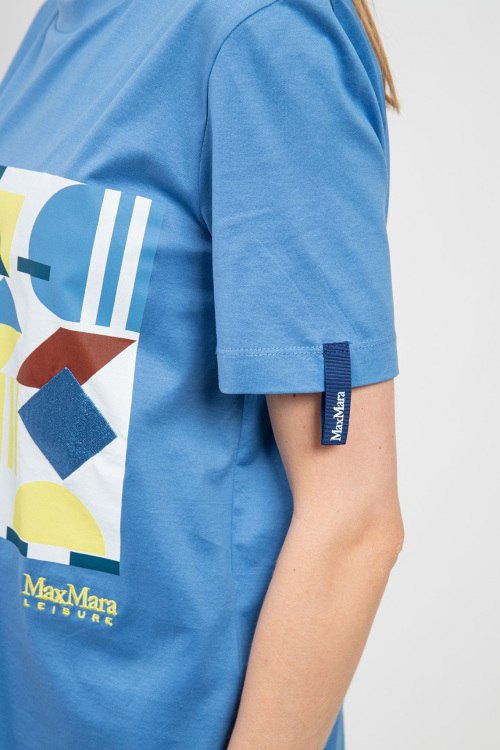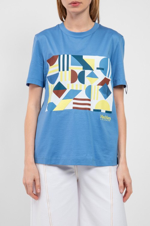 Женская голубая хлопковая футболка Obliqua от Max Mara Leisure (Макс Мара Лэжэ). Геометрический принт с вышивкой, круглый вырез горловины, короткий рукав, классическая длина.