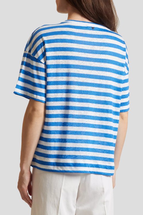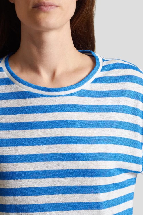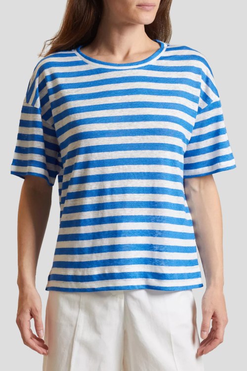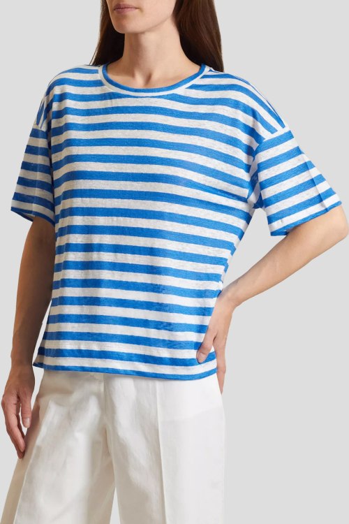 Детали: Женская голубая льняная футболка от Max Mara (Макс Мара). Круглый вырез горловины, короктие рукава, приспущенная линия плеча, дизайн в полоску