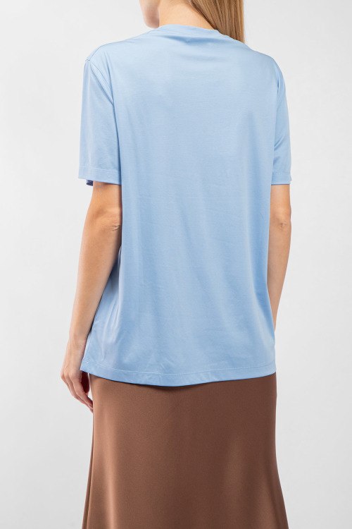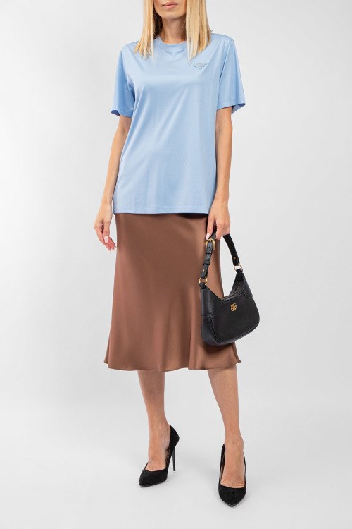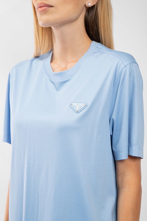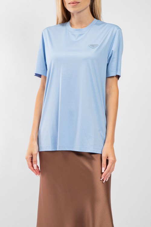 Женская голубая хлопковая футболка от Prada (Прада). Логотип на груди, круглый вырез горловины, короткий рукав, удлиненная длина.