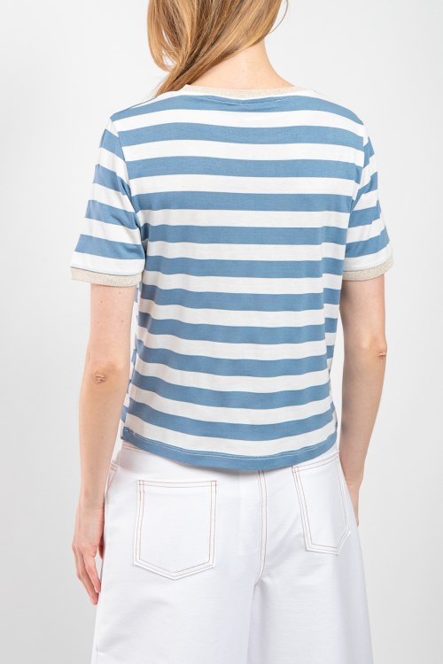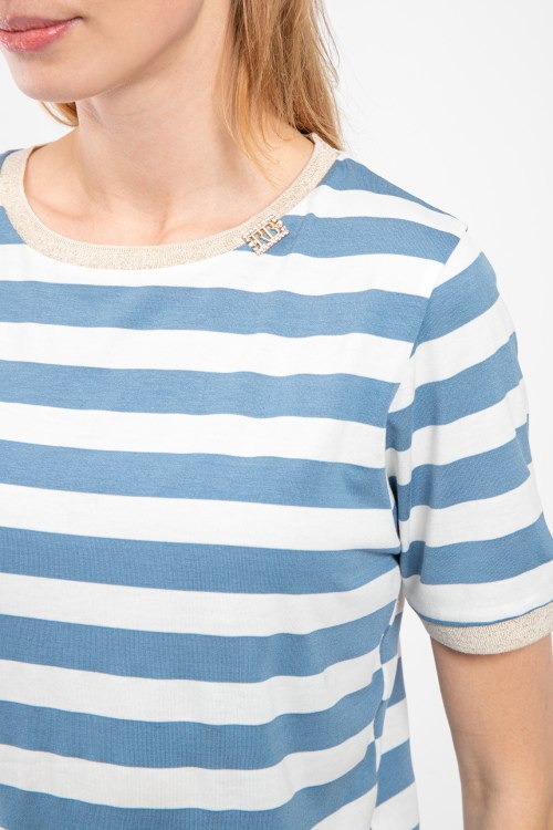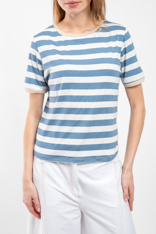 Женская бело-голубая хлопковая футболка от Roberta Biagi (Роберта Бьяджи). Полоска по всей поверхности, круглый вырез горловины, короткий рукав, классическая длина. Замеры для размера UNI: длина: 52 см, ширина по груди 46 см, ширина по талии: 46 см, длина рукава: 8 см, ширина рукава: 18 см.