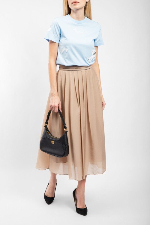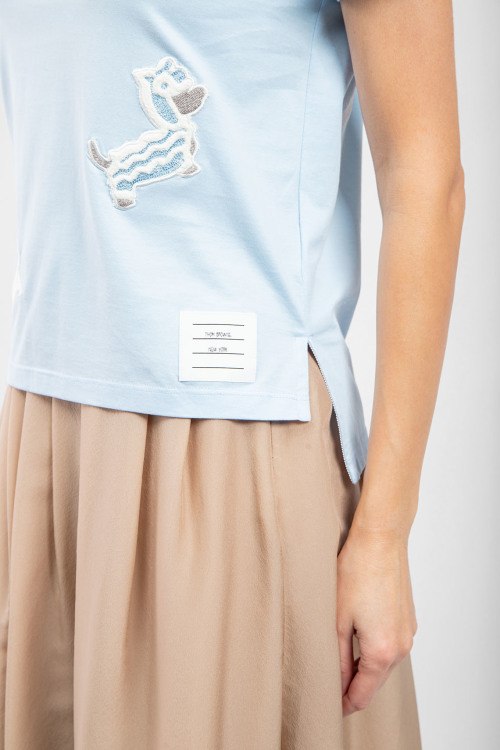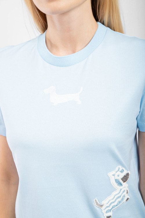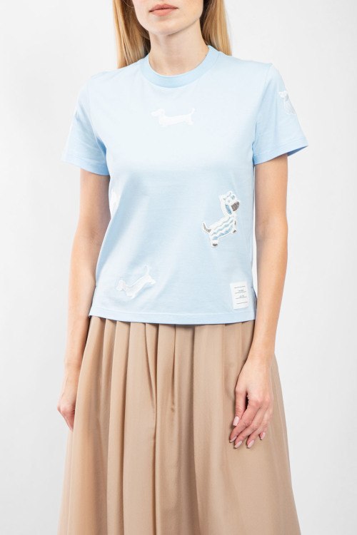 Детали: Женская голубая хлопковая футболка от Thom Browne (Том Браун). Вышивка по всей поверхности, круглый вырез горловины, короткий рукав, классическая длина