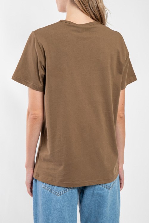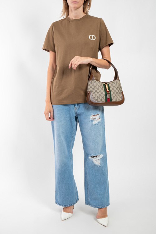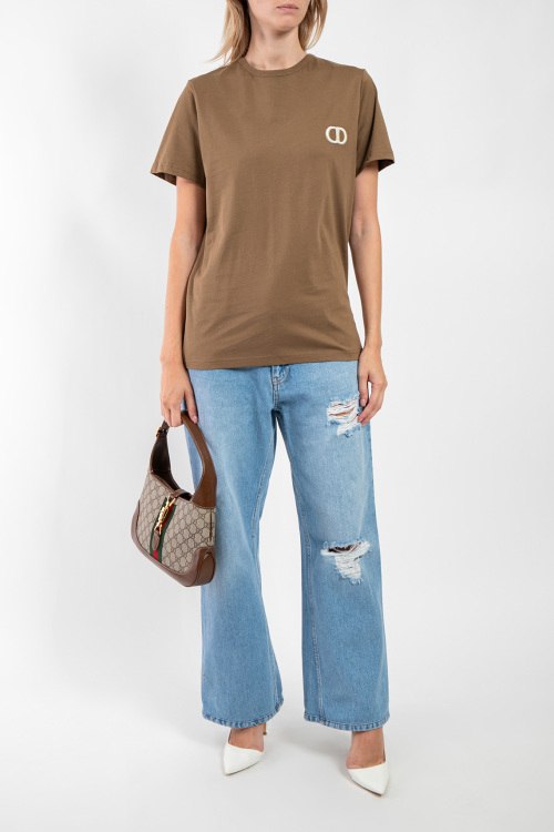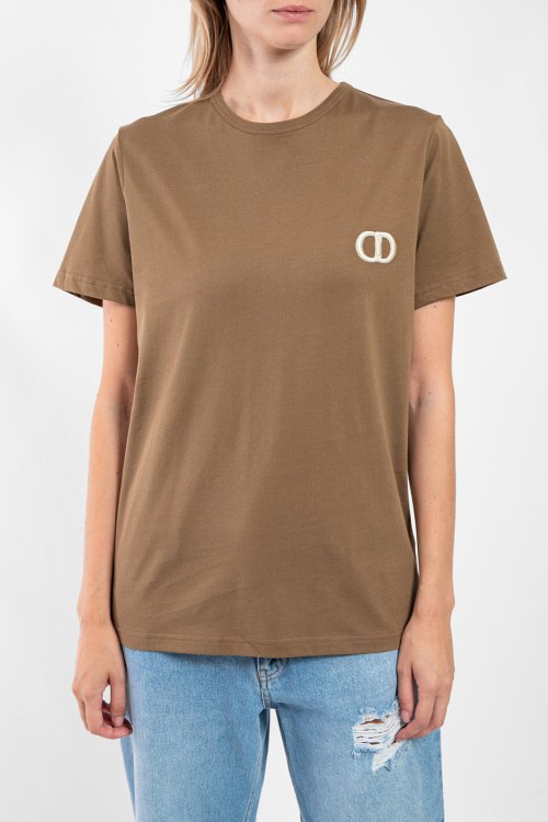 Женская коричневая хлопковая футболка от Christian Dior (Кристиан Диор). Вышитый логотип на груди, круглый вырез горловины, короткий рукав, классическая длина.
