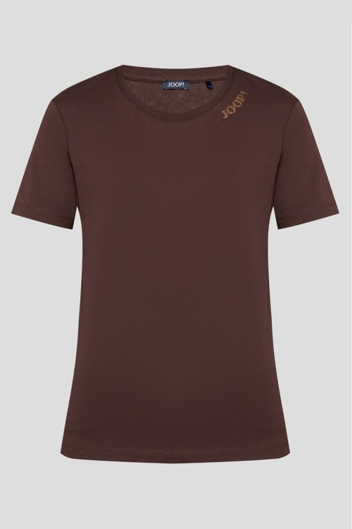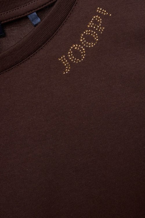 Детали: Женская коричневая хлопковая футболка от Joop! (Йооп!). Логотип из кристаллов, круглый вырез горловины, короткий рукав, классическая длина. Длина рукава: короткий, для размера 38 - 20 см, обхват груди: для размера 38 - 90 см, обхват талии: для размера 38 - 90 см, длина изделия по среднему шву спинки от горловины: для размера 38 - 61 см