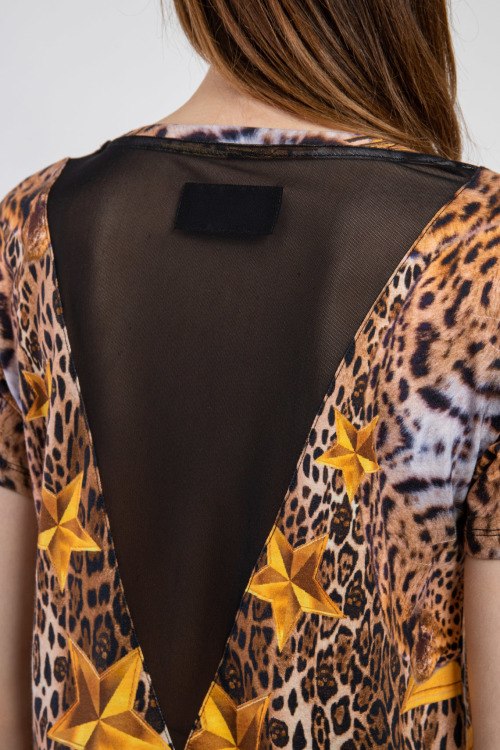Женская коричневая футболка из хлопка от Philipp Plein (Филипп Плейн). Круглый вырез горловины, сетчатая вставка на спине, короткие рукава, принт по всей поверхности изделия, удлиненная длина по спинке.