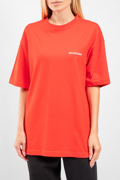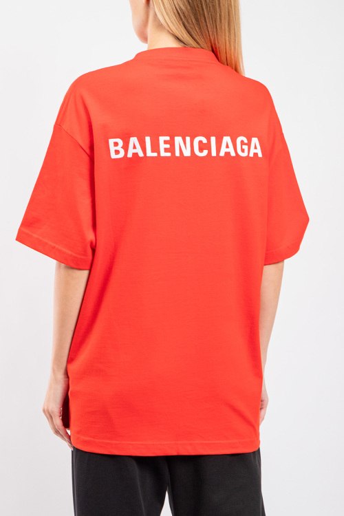 Женская красная хлопковая футболка от Balenciaga (Баленсиага). Фасон oversize, логотип на груди и на спине, круглый вырез горловины, короткий рукав, удлиненная длина.