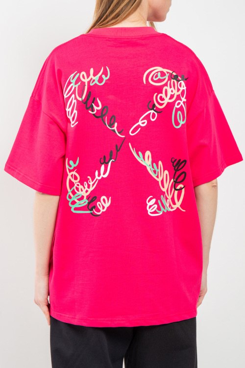 Женская малиновая хлопковая футболка от Off-White (Офф-Вайт). Принт на груди и на спине, круглый вырез горловины, фасон oversize, короткий рукав, удлиненная длина.