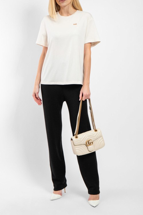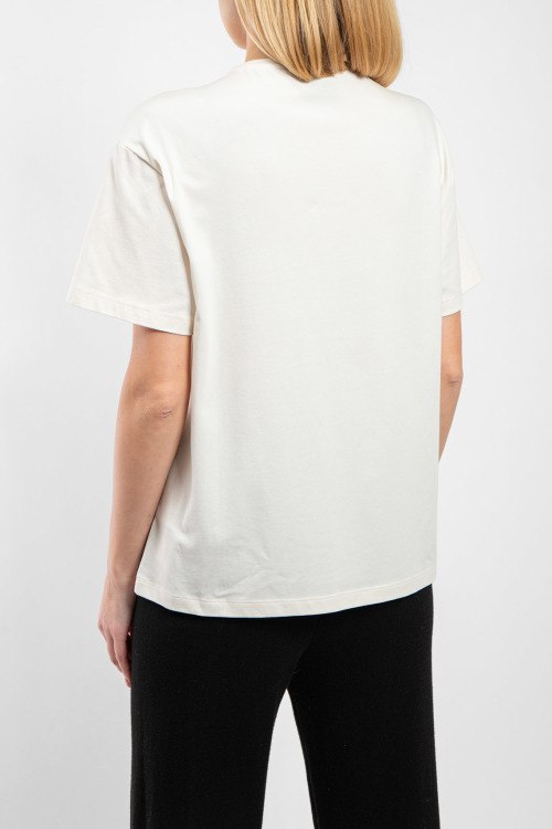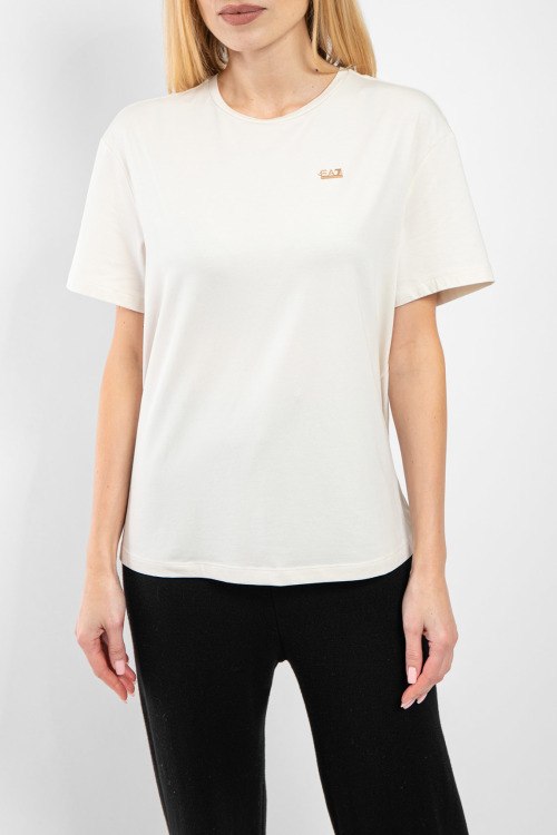 Женская футболка молочного оттенка из хлопкового микса от EA7 Emporio Armani (ЕА7 Эмпорио Армани). Круглый вырез горловины, короткие рукава, брендированная нашивка золотистого цвета на груди.