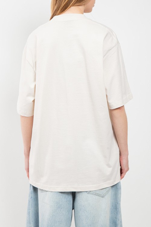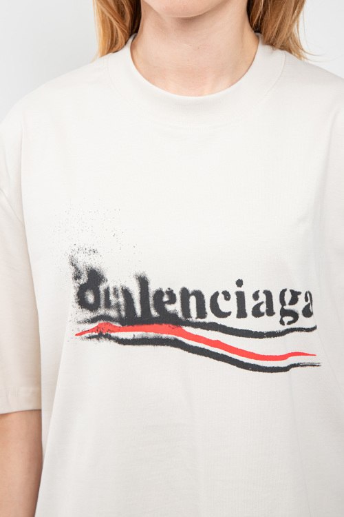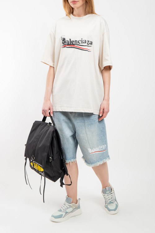 Женская хлопковая футболка молочного оттенка от Balenciaga (Баленсиага). Логотип на груди, круглый вырез горловины, фасон oversize, короткий рукав, удлиненная длина.