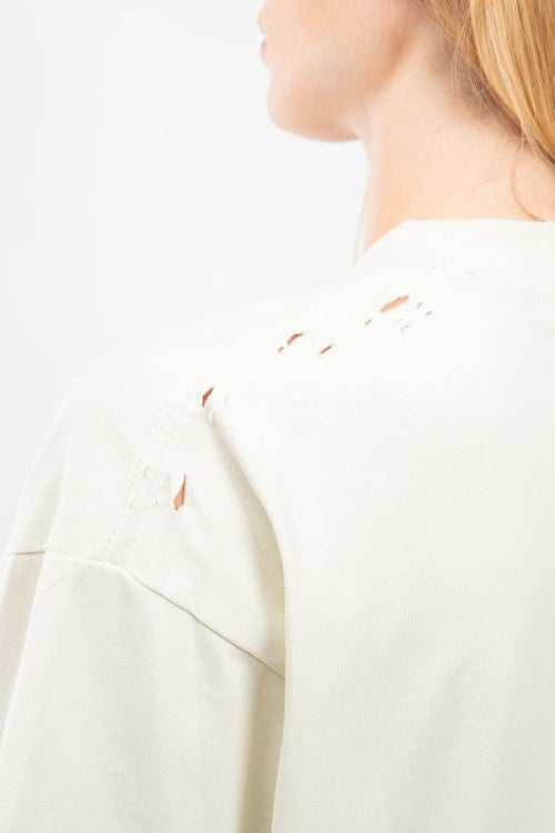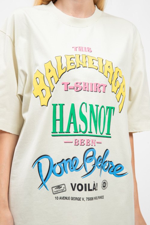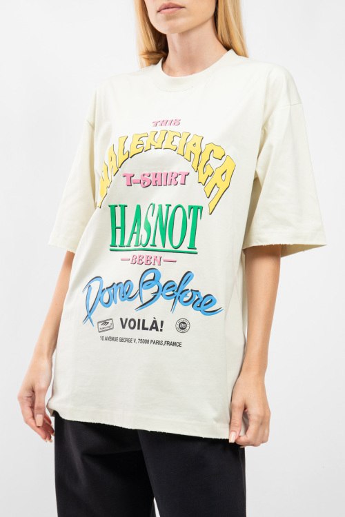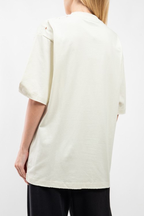 Женская хлопковая футболка молочного оттенка от Balenciaga (Баленсиага). Фасон oversize, принт на груди, рваные детали, круглый вырез горловины, короткий рукав, удлиненная длина.
