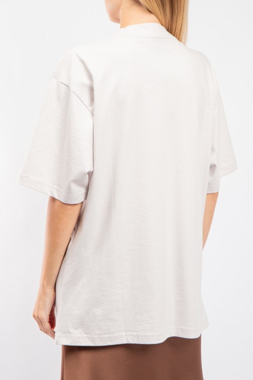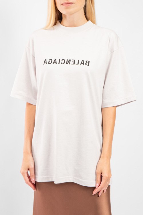 Женская хлопковая футболка молочного оттенка от Balenciaga (Баленсиага). Фасон oversize, логотип на груди, круглый вырез горловины, короткий рукав, удлиненная длина.