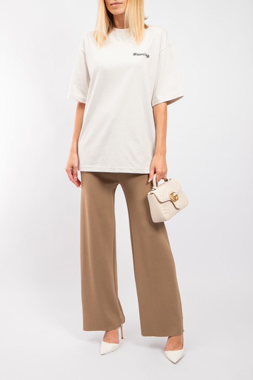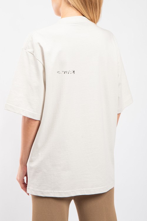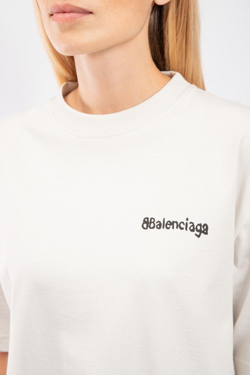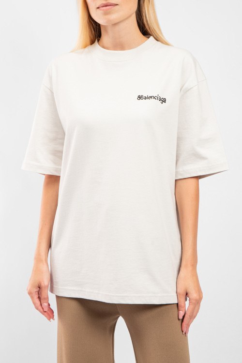 Женская хлопковая футболка молочного оттенка от Balenciaga (Баленсиага). Фасон oversize, логотип на груди, круглый вырез горловины, короткий рукав, удлиненная длина.