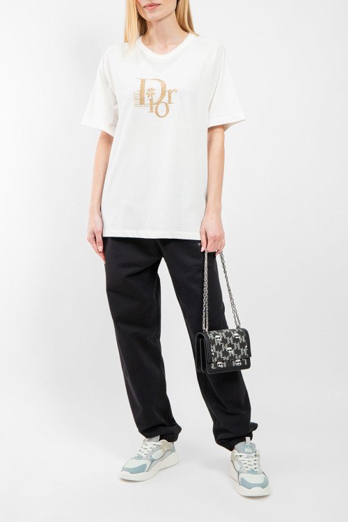 Женская хлопковая футболка молочного оттенка от Christian Dior (Кристиан Диор). Вышитый логотип на груди золотой нитью, круглый вырез горловины, короткий рукав, удлиненная длина.
