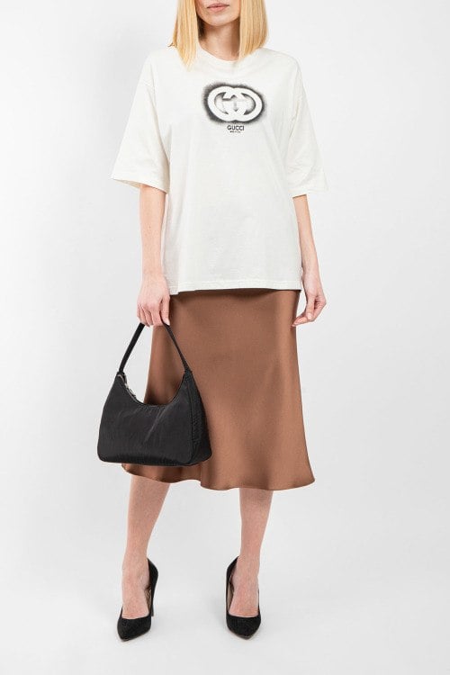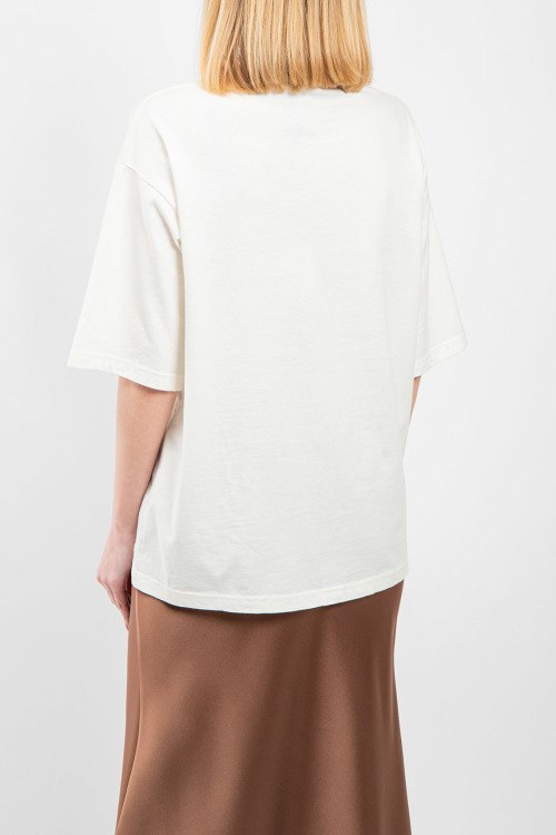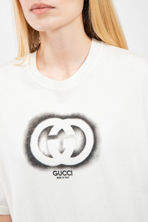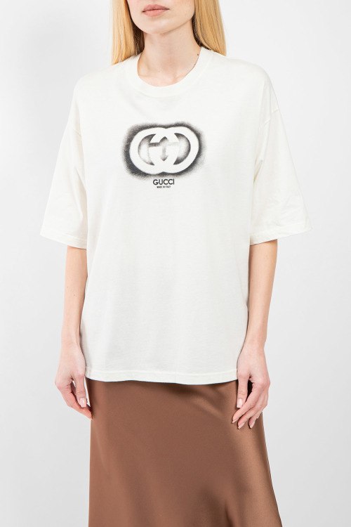 Женская хлопковая футболка молочного оттенка от Gucci (Гуччи). Принт с логотипом на груди, фасон oversize, круглый вырез горловины, короткий рукав, удлиненная длина.